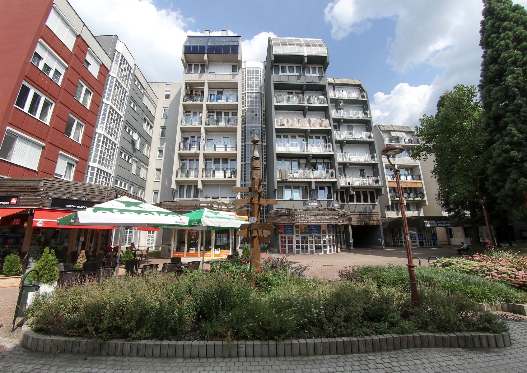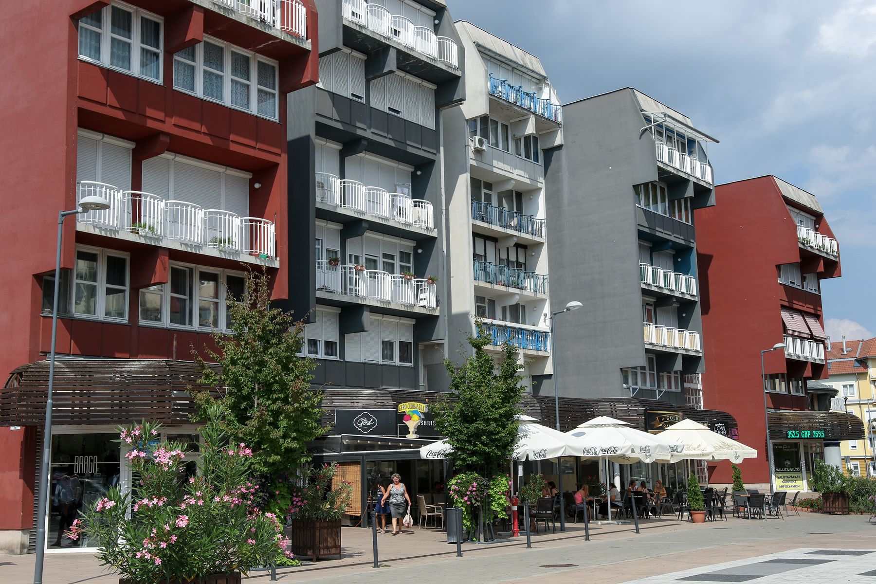 A belváros üde színfoltjaként magasodnak ezek az érdekes lakóházak, melyek erkélykorlátjainak és hullámzó homlokzatainak összhatása csipkemintát imitál; de nem csak a csipkeminta miatt jelentenek érdekességet, hanem a göcseji boronaházak csonkakontyos tetőrészét is megjelenítik.