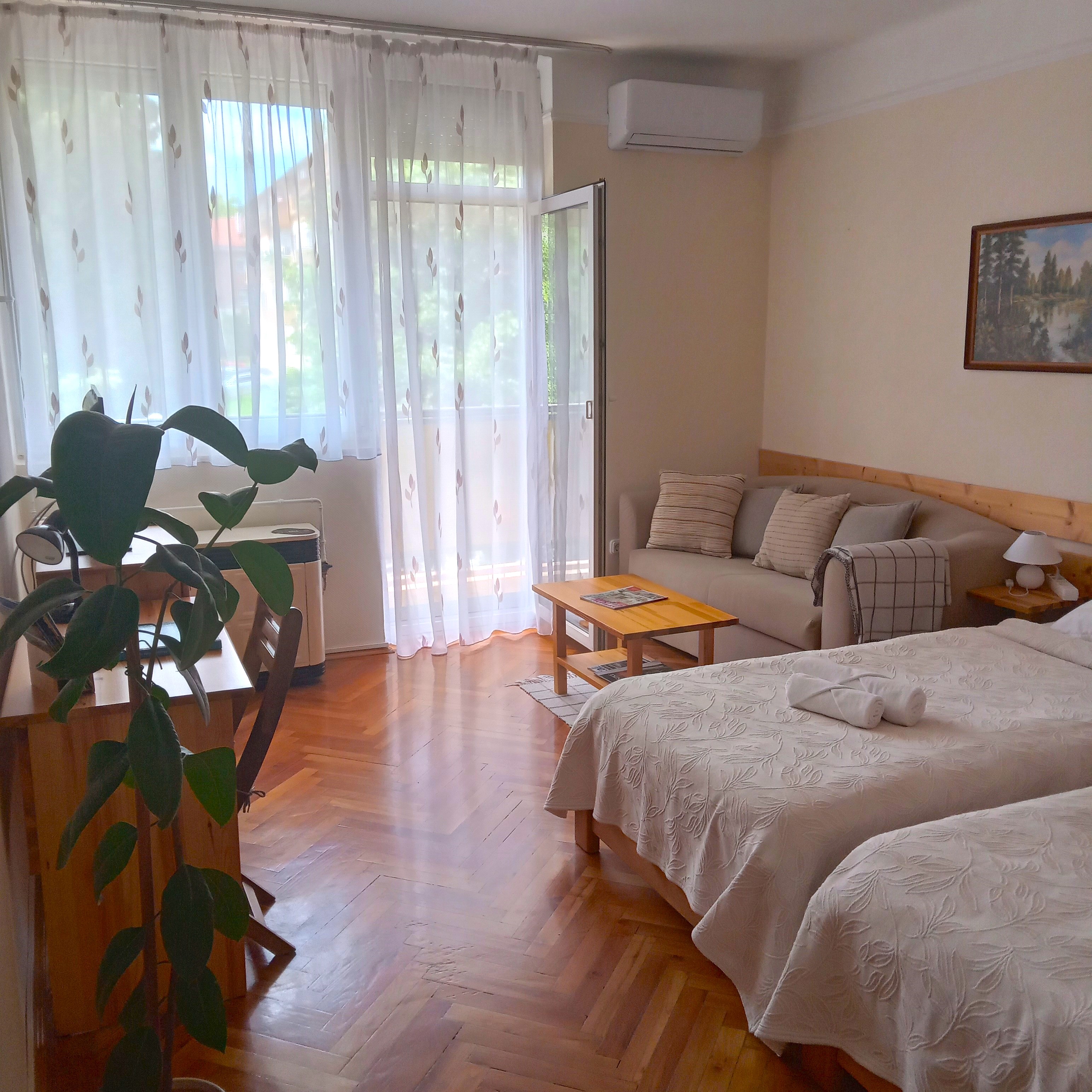5 fő befogadására alkalmas apartmanunk belváros közeli, csendes helyen lévő társasház első emeletén található.