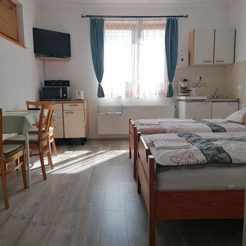 A hozzánk érkező vendégeket saját fürdőszobás, síkképernyős tv-vel, hűtőszekrénnyel felszerelt kettő,- vagy háromágyas szobával várjuk. Mikrohullámú sütő, kávé-és teafőző, hajszárító használata biztosított. Parkolásra zárt udvarunkban van lehetőség.